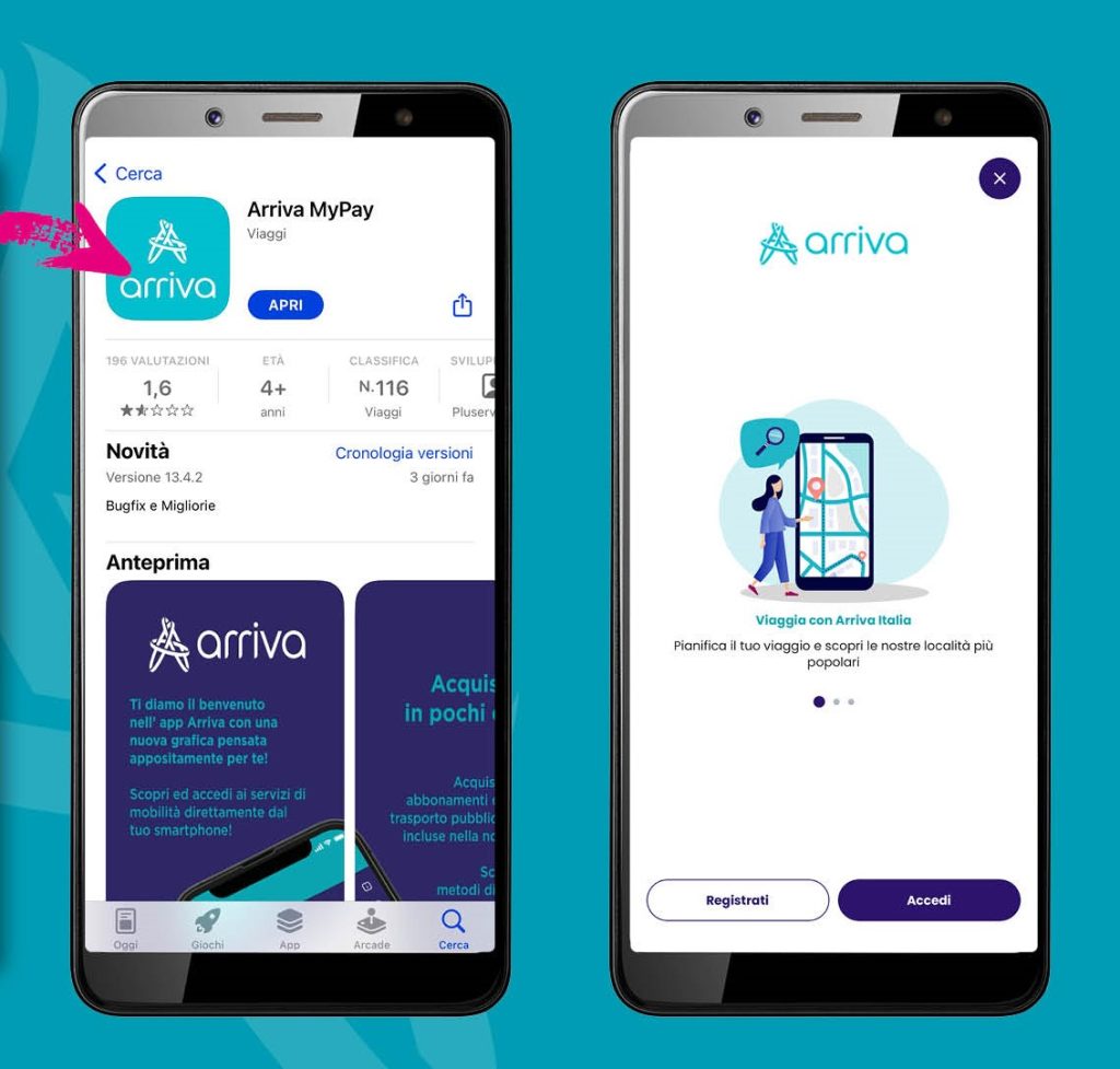 Il biglietto Mobilità Senza Confini è disponibile esclusivamente tramite l’app Arriva MyPay nella sezione “biglietti a tariffa fissa”. Scarica l’app, seleziona il tuo territorio e acquista il biglietto speciale valido domenica 21 settembre. Ricordati di convalidare il biglietto con l’App in fase di salita a bordo!